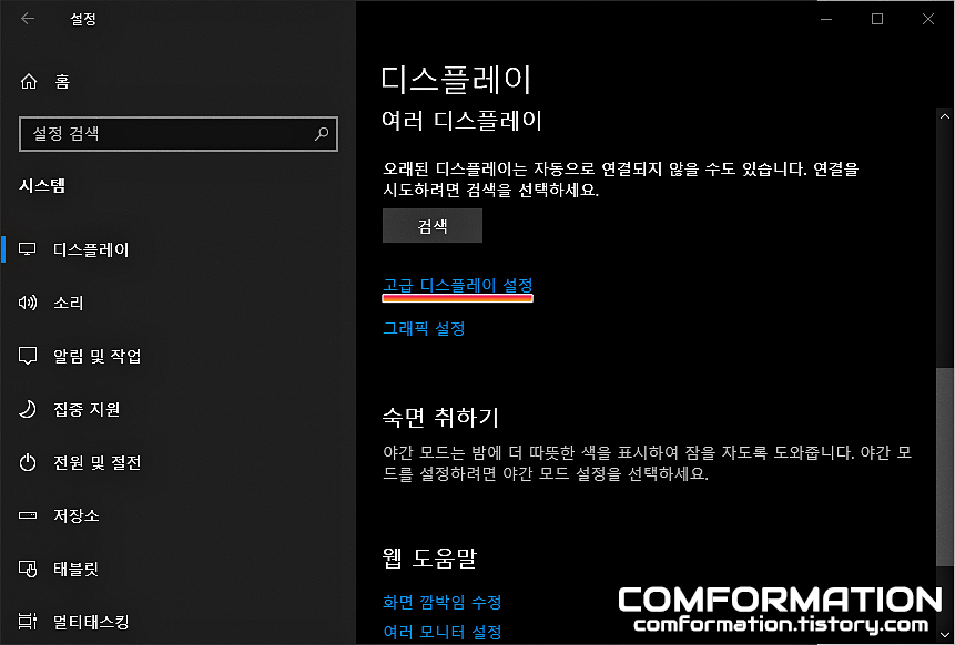 시스템 메뉴로 들어와 보면 기본적으로 디스플레이 메뉴에 맞춰져 있다. 만약, 여기서 기본 메뉴가 디스플레이가 아니라면 이미지처럼 디스플레이로 맞춰보자.