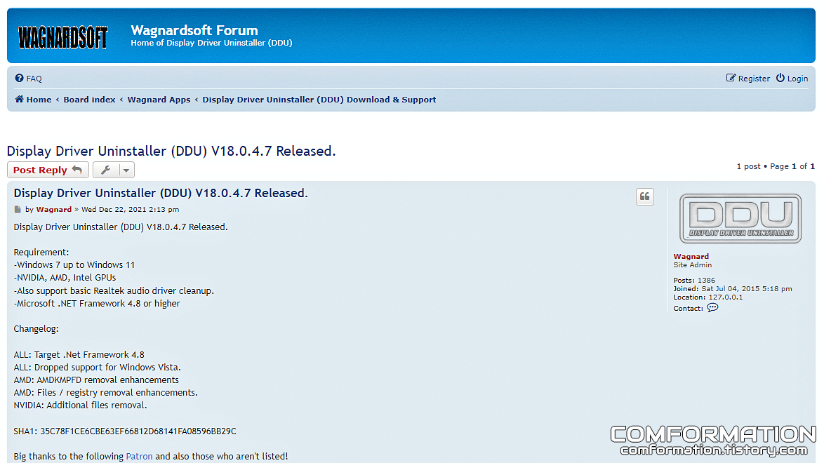 여기서는 아래쪽으로 스크롤하여 *** Download DDU "Portable / self-extracting" *** 버튼을 눌러주는 것으로 프로그램을 받을 수 있다. 잘 보면 다운로드 링크가 숨어있는 느낌이 있어 약간은 번거롭지만, 그래픽카드 드라이버를 지우는 데엔 이것만 한 프로그램이 없기에 귀찮더라도 다른 방법을 찾는 것 나을 수 있다.