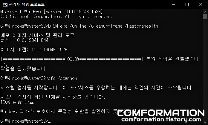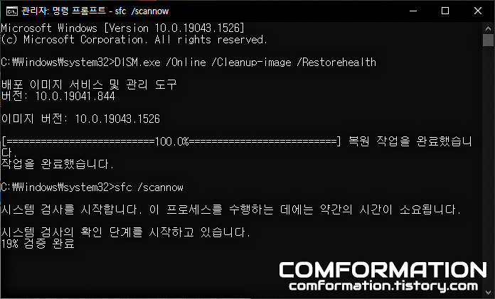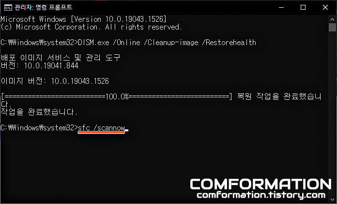 앞서 입력했던 DISM 명령어를 통한 작업의 진행도가 100%에 도달하여 윈도우의 이미지가 제대로 복구되었다면, 이어서 sfc /scannow를 입력하고 마찬가지로 엔터를 쳐보자.