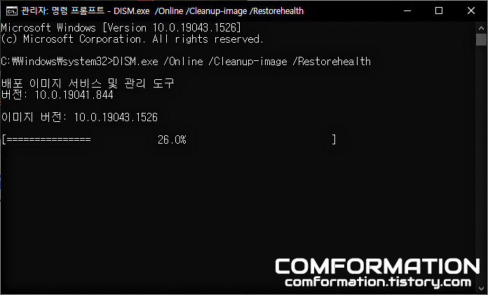 명령어를 붙여넣고 엔터를 쳐주면 위와 같이 배포 이미지 서비스 및 관리 도구 및 퍼센트로 진행도를 확인할 수 있는데, 온라인을 통해 손상된 파일이 존재하는 경우 받아서 교체하는 작업을 자동으로 진행하게 된다.