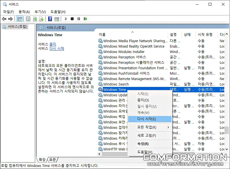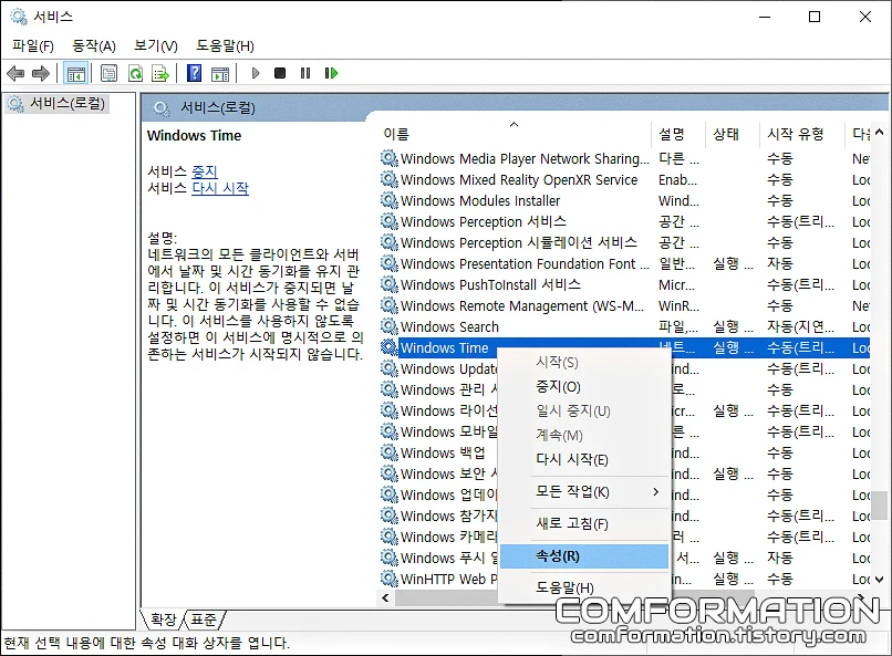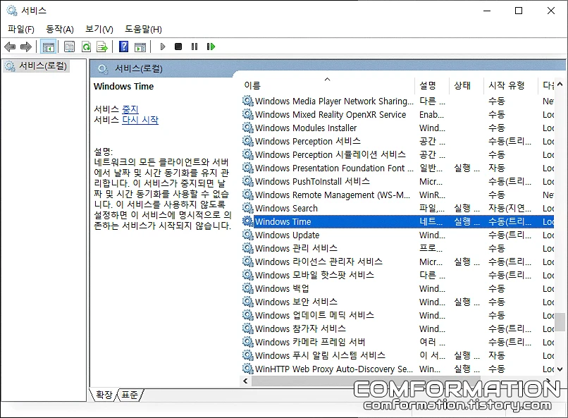 그럼 현재 컴퓨터에서 다뤄지고 있는 서비스들을 확인할 수 있는데, 이 항목들 중 Windows Time을 찾아보자. 이미지 기준으로는 위와 같은 곳에 위치하고 있다.
