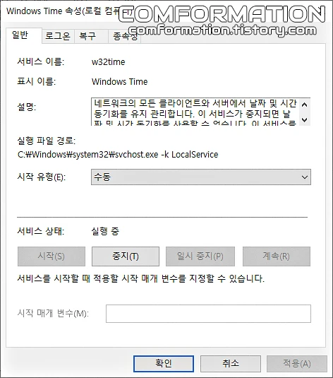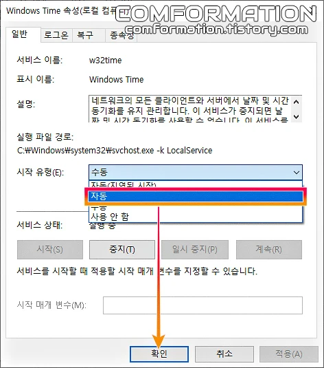 이어서 Windows Time 속성 창을 통해 시작 유형을 자동으로 변경한 뒤, 아래의 적용 또는 확인을 눌러 값을 저장해주면 된다. 이 방법으로 시간이 제대로 맞춰졌다고 하더라도, 혹시 모르니 아래의 과정까지 따라가는 것을 권장한다.