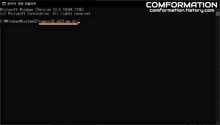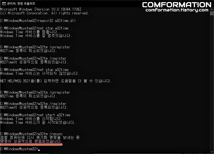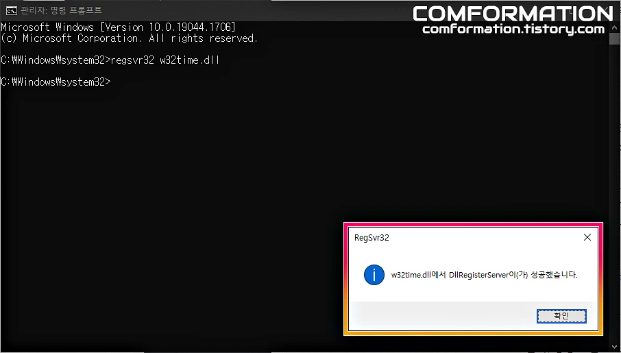 그럼 위와 같이 w32time.dll에서 DllRegisterServer이(가) 성공했습니다.라는 문구가 표기된다.