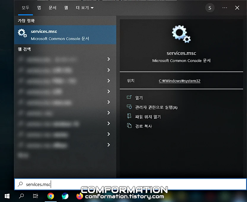 먼저, 작업 표시줄의 검색 상자를 통해 services.msc를 검색 후, services.msc를 실행해보자. 해당 검색 상자를 여는 방법을 잘 모르겠다면 키보드의 단축키(Windows + S)를 이용해서 쉽게 열어볼 수 있다. 검색 상자가 열리면 그곳에 services.msc를 입력하고, 찾은 services.msc를 실행해주면 된다.
