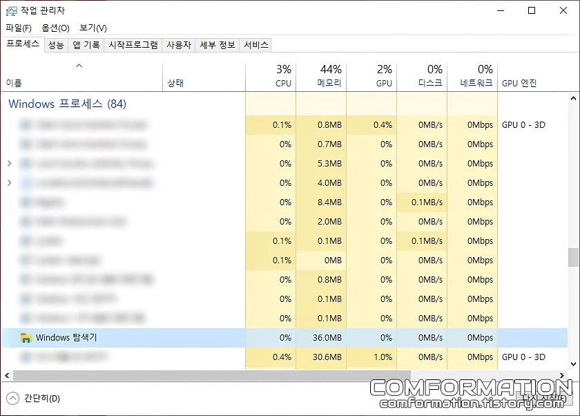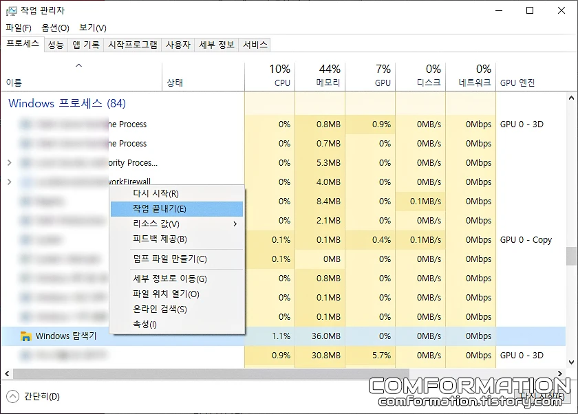 작업 관리자가 정상적으로 열렸다면, 여기서 Windows 탐색기라는 항목을 찾아보자. 개인적으로는 프로세스 탭 내의 Windows 프로세스 탭에서 찾을 수 있었다. 요약하자면, 작업 관리자를 열고 아래로 스크롤을 내리면서 Windows 탐색기를 찾아주면 된다.