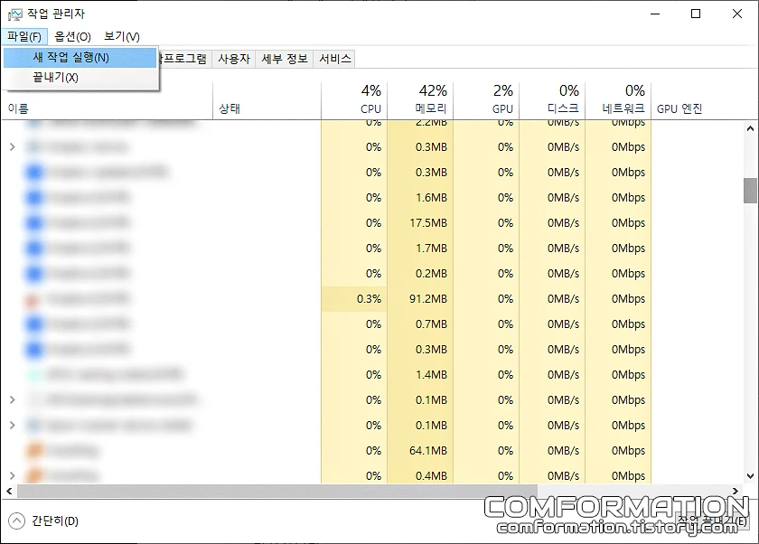 이어서 작업 관리자의 좌측 상단부 파일 메뉴를 통해 새 작업 실행(N)을 눌러주고,