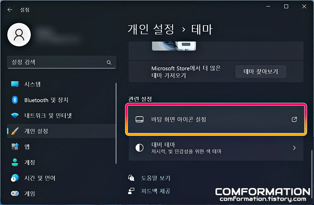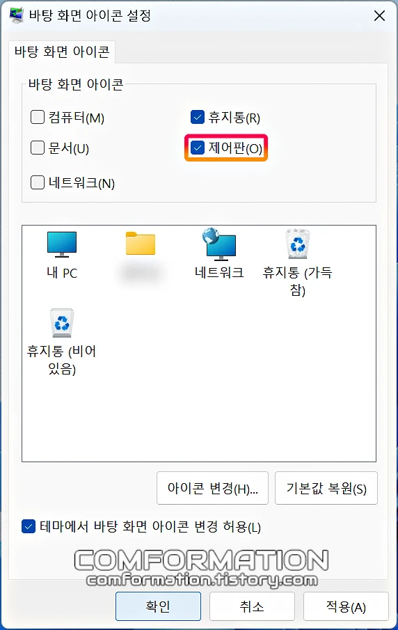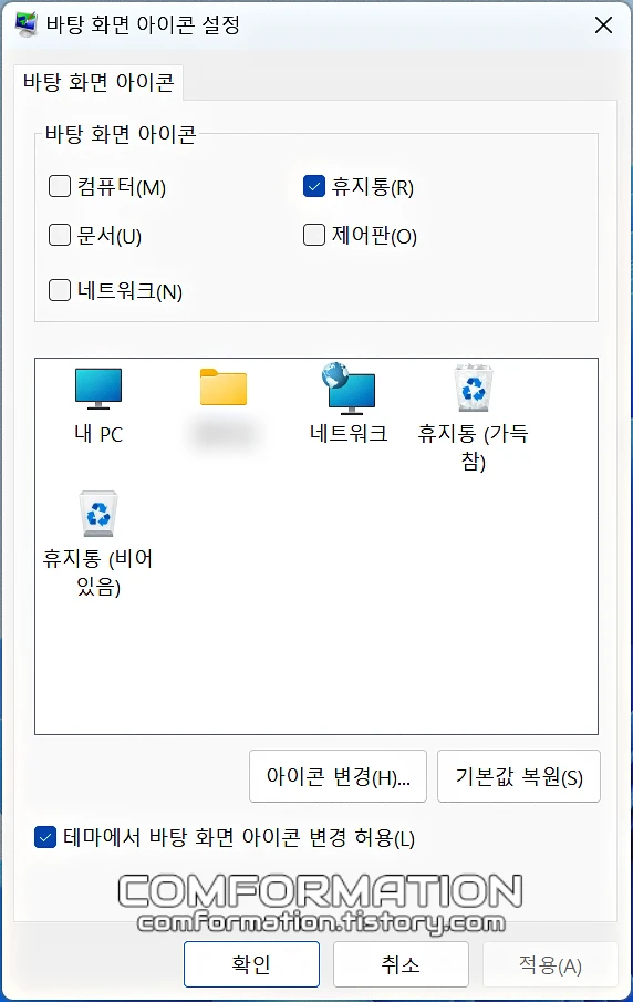 바탕화면 아이콘 설정 옵션을 찾을 수 있게 된다.