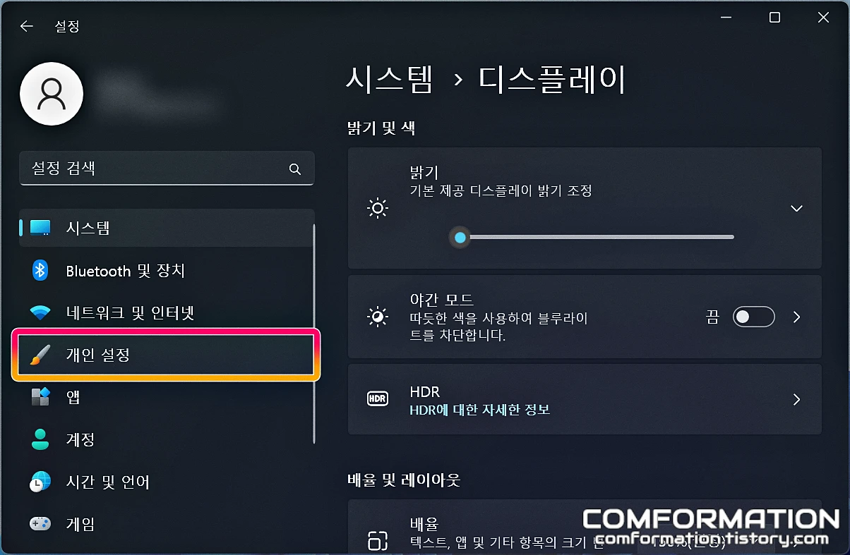 그럼 설정의 시스템 창이 뜨는데, 여기서 좌측의 개인 설정 메뉴로 들어가 보면,