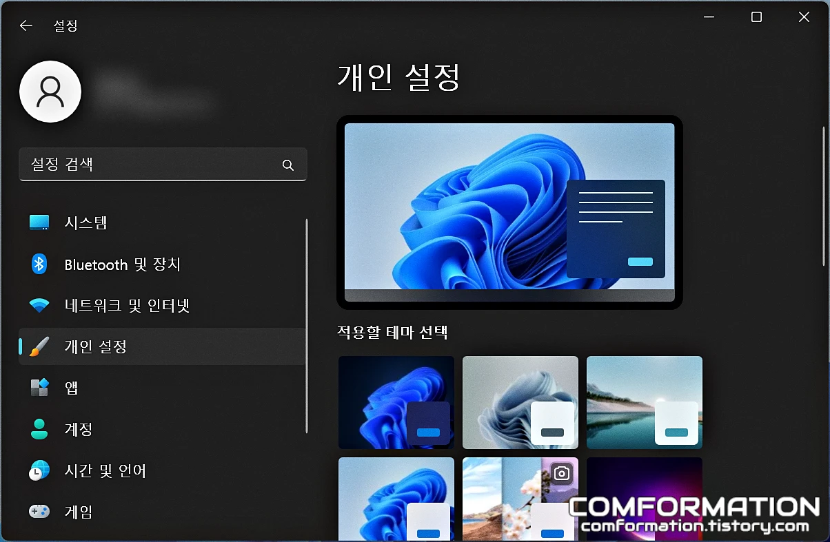 이렇게 테마를 선택할 수 있는 화면이 나오게 된다. 결과적으로는 제어판 관련 옵션은 테마에서 다루는 게 맞지만, 메뉴를 하나 더 거쳐야만한다. 따라서, 아래로 드래그를 해 보도록 하자.