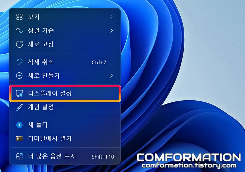 먼저, 마우스를 이용해 바탕화면에 우클릭하여 위와 같이 컨텍스트 메뉴를 불러온 뒤, 디스플레이 설정을 눌러보도록 하자.