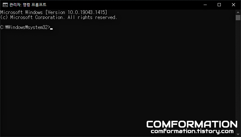 그럼 명령 프롬프트가 열리게 되는데, 제목의 관리자라는 문구와 세 번째 줄의 경로가 C:\Windows\system32>로 표기된다면 정상적으로 관리자 권한으로 실행된 것이라 보면 된다.