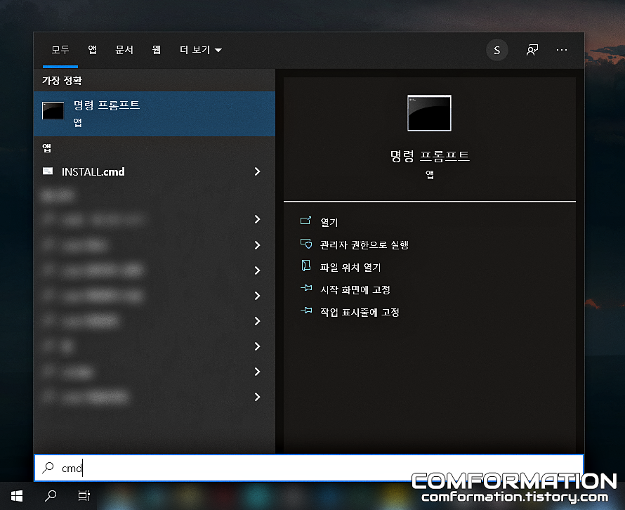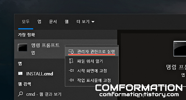 여기서 무작정 실행하지 말고, 명령 프롬프트를 우클릭해서 관리자 권한으로 실행을 눌러서 실행해보자. 윈도우10이라면 굳이 우클릭하지 않아도 오른쪽 메뉴에 관리자 권한 버튼이 있기는 하다.